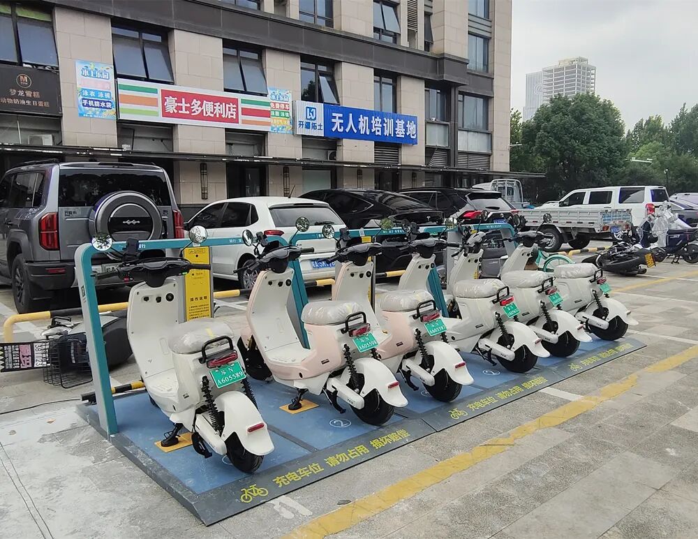在宿遷駱馬湖旅游度假區星辰國際酒店,吾限充無線充電樁與電動車分時租賃的結合成為一道亮麗風景。酒店坐落于駱馬湖畔,周邊環境優美,吸引眾多游客。吾限充將無線智能充電技術與共享電單車結合,把電單車原有腳撐換