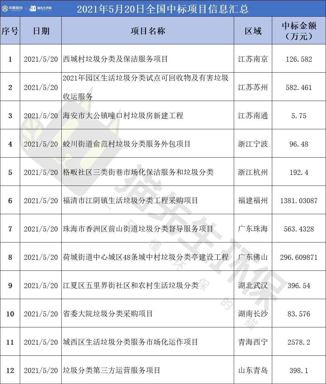 2021年5月20日,全國中標項目共12個。